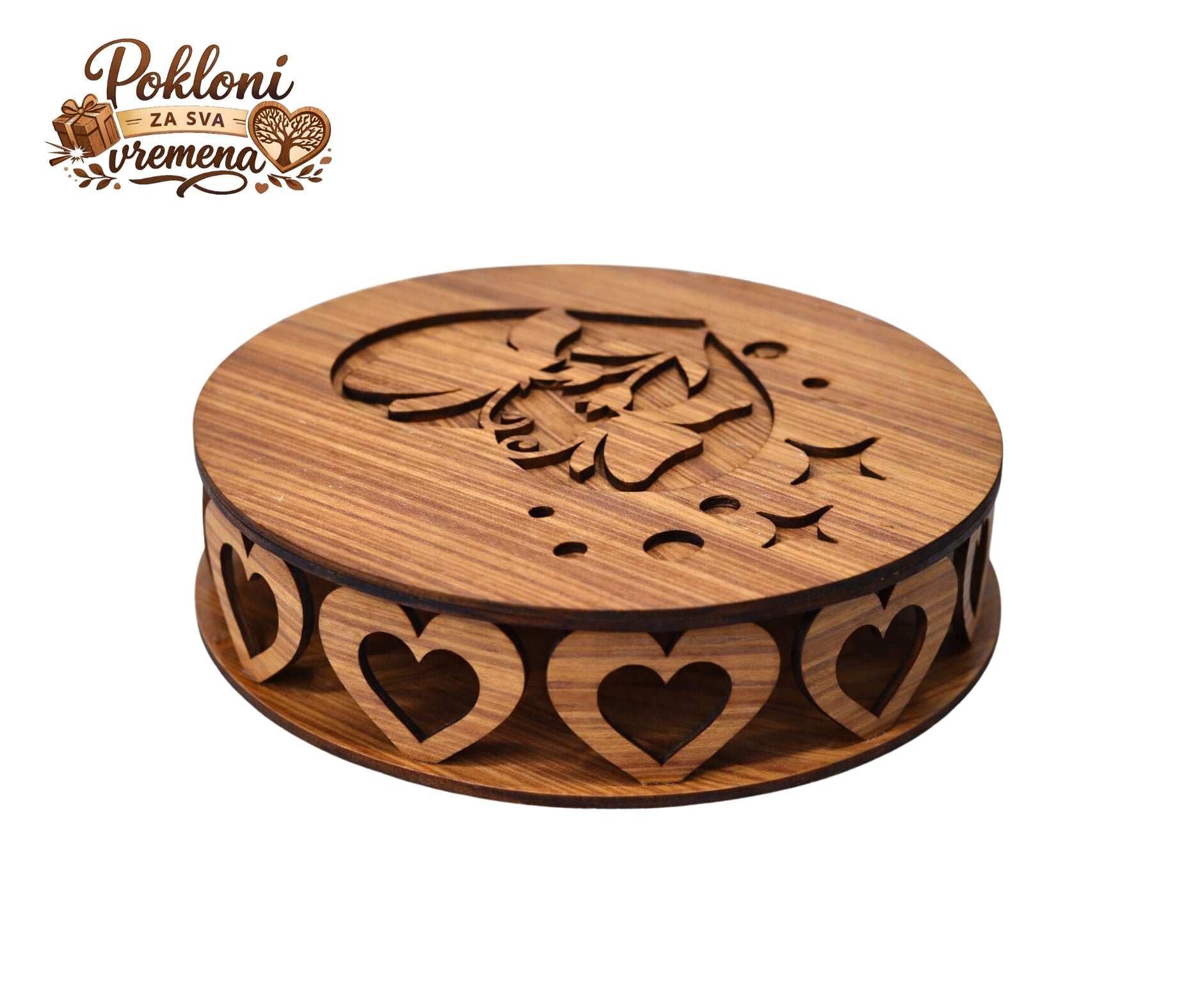 Unikatna drvena kutija izrađena preciznim laserskim rezanjem, savršen je spoj elegancije i funkcionalnosti. Detaljno obrađen poklopac s bogatim ornamentima daje joj luksuzan i ručno rađen izgled, dok prirodna boja drveta unosi toplinu u svaki prostor.