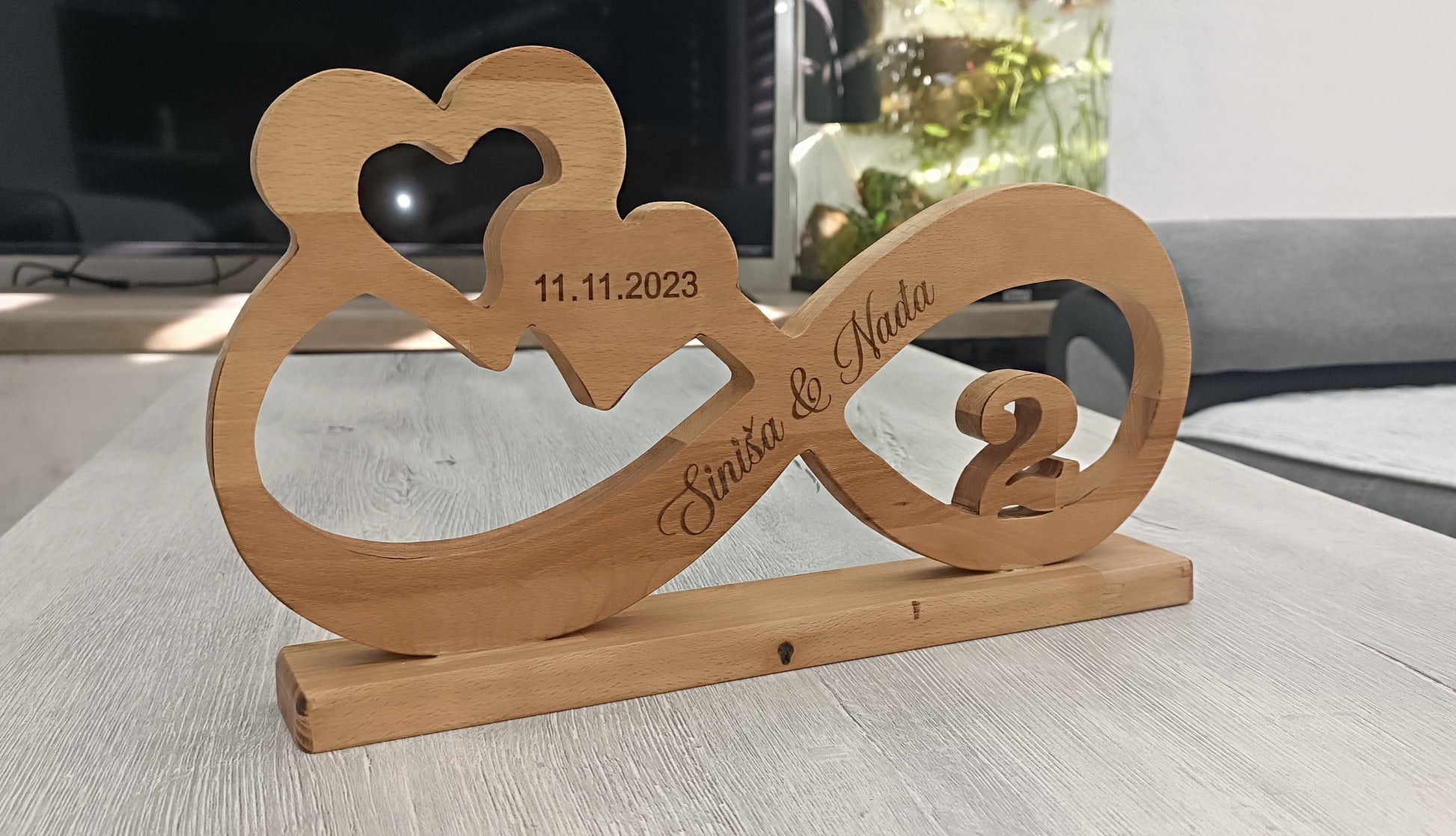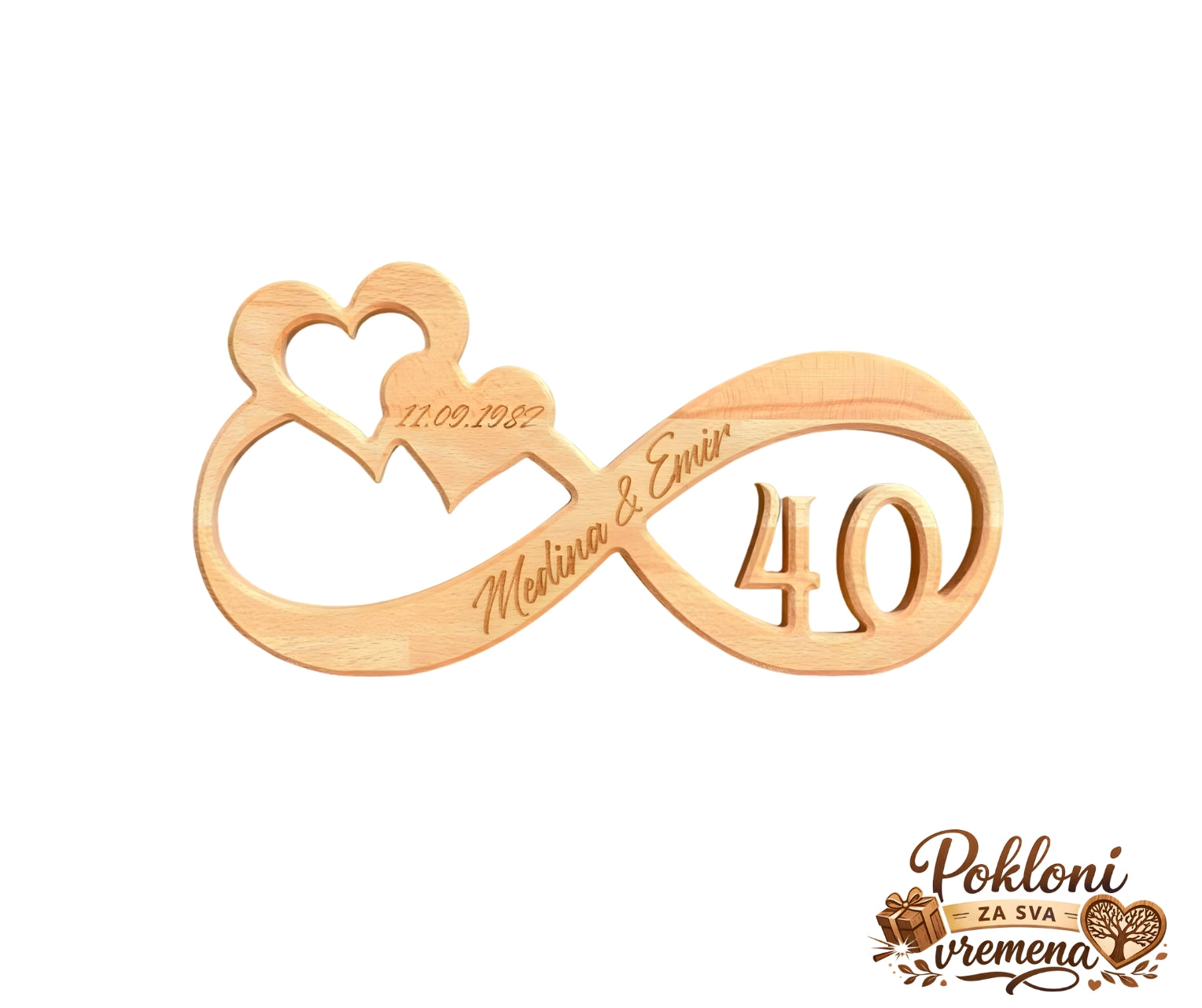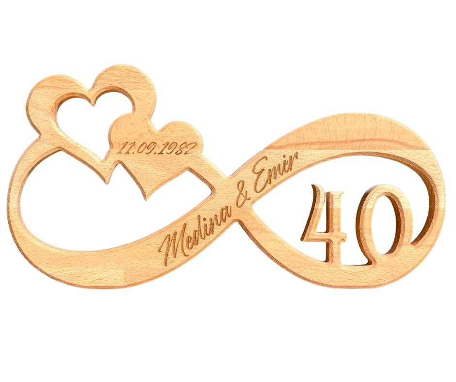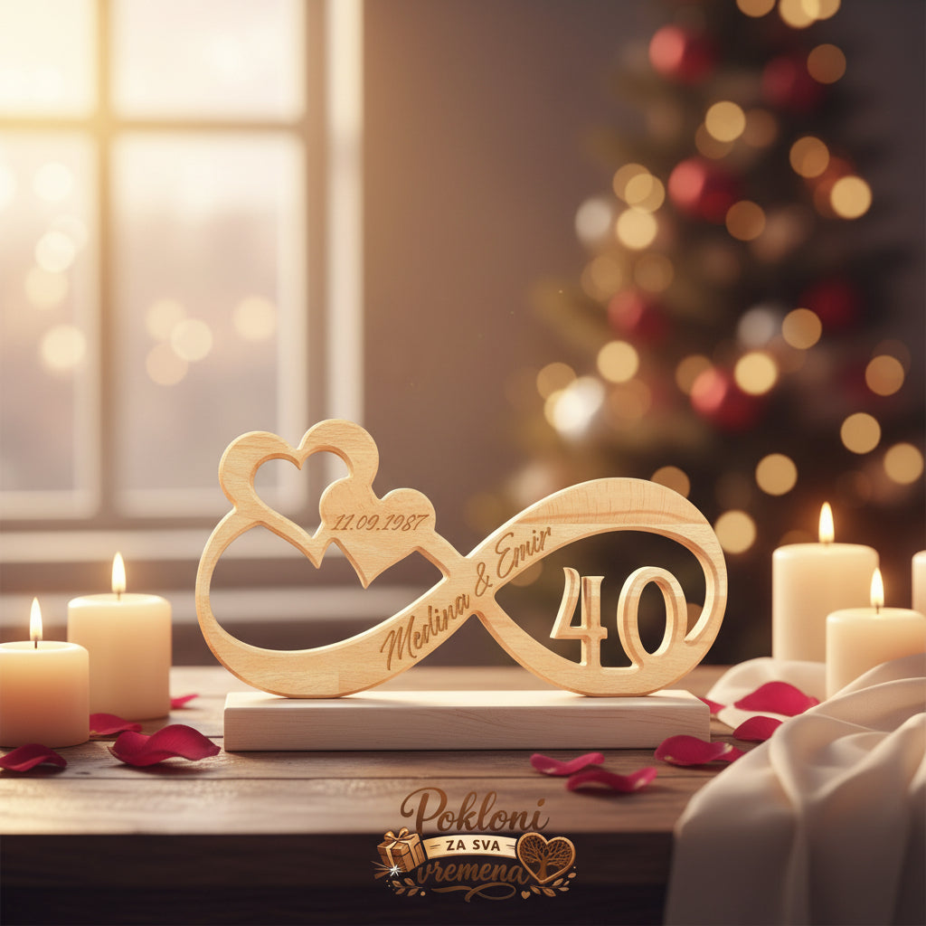 Poseban i emotivan poklon koji simbolizira trajnu ljubav i zajedništvo. Ovaj dekorativni znak u obliku beskonačnosti izrađen je od kvalitetnog bukovog drveta, s pažljivo ugraviranim imenima, datumom i brojem godina, što ga čini jedinstvenim i nezaboravnim uspomenom.